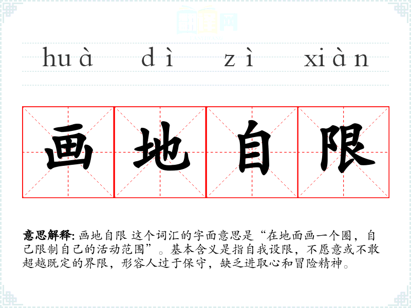 画地自限 这个词汇的字面意思是“在地面画一个圈,自己限制自己的活动范围”。基本含义是指自我设限,不愿意或不敢超越既定的界限,形容人过于保守,缺乏进取心和冒险精神。