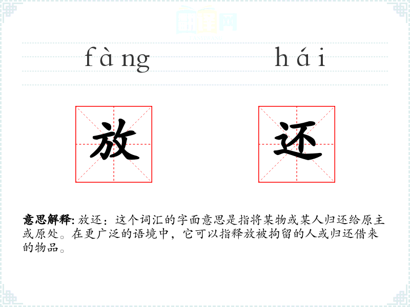 “放还”这个词在中文中具有丰富的含义和情感色彩,它不仅仅是一个动作的描述,还蕴含了正义、道德和秩序的恢复。在我的语言学*和表达中,理解和正确使用这个词可以帮助我更准确地传达我的意图和情感。