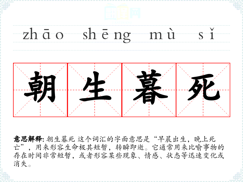 朝生暮死 这个词汇的字面意思是“早晨出生,晚上死亡”,用来形容生命极其短暂,转瞬即逝。它通常用来比喻事物的存在时间非常短暂,或者形容某些现象、情感、状态等迅速变化或消失。