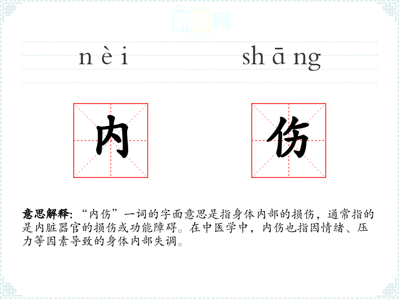 “内伤”一词的字面意思是指身体内部的损伤,通常指的是内脏器官的损伤或功能障碍。在中医学中,内伤也指因情绪、压力等因素导致的身体内部失调。