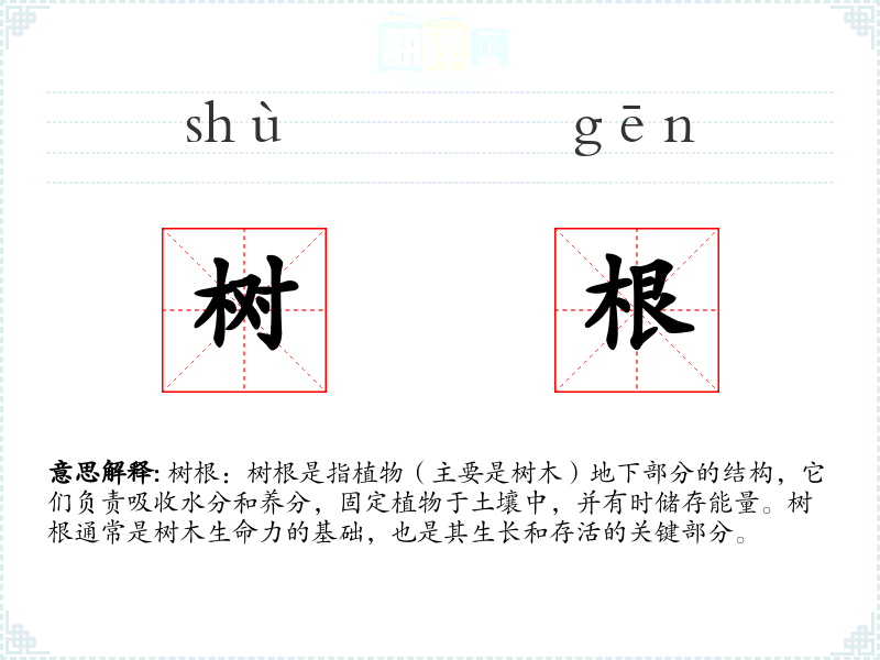 - 反义词:树冠、树梢(这些词汇与树根在树木结构中形成对比,分别指代树木的地上部分)