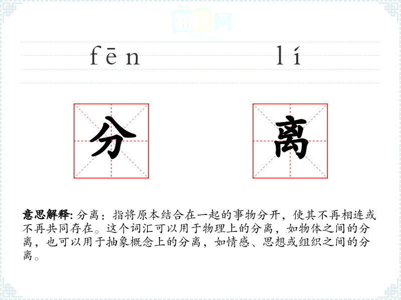 分离:指将原本结合在一起的事物分开,使其不再相连或不再共同存在。这个词汇可以用于物理上的分离,如物体之间的分离,也可以用于抽象概念上的分离,如情感、思想或组织之间的分离。