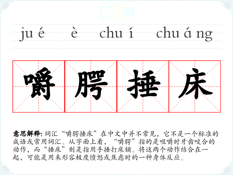 词汇“嚼腭捶床”在中文中并不常见,它不是一个标准的成语或常用词汇。从字面上看,“嚼腭”指的是咀嚼时牙齿咬合的动作,而“捶床”则是指用手捶打床铺。将这两个动作结合在一起,可能是用来形容极度愤怒或焦虑时的一种身体反应。