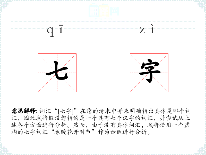 词汇“[七字]”在您的请求中并未明确指出具体是哪个词汇,因此我将假设您指的是一个具有七个汉字的词汇,并尝试从上述各个方面进行分析。然而,由于没有具体词汇,我将使用一个虚构的七字词汇“春暖花开时节”作为示例进行分析。
