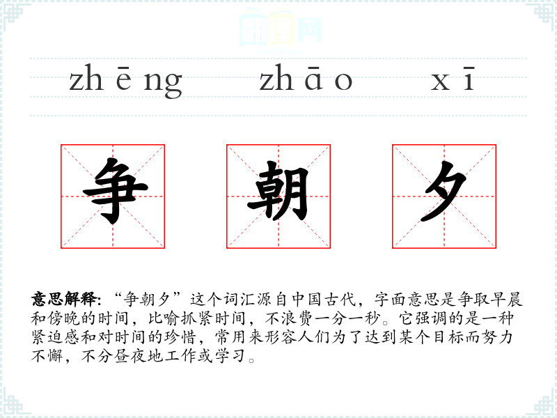 “争朝夕”这个词汇的词源可以追溯到**古代的文学作品,如《诗经》中就有对时间的珍惜和紧迫感的描述。随着时间的推移,这个词汇逐渐被广泛应用于各种语境,成为表达时间紧迫和努力奋斗的常用语。