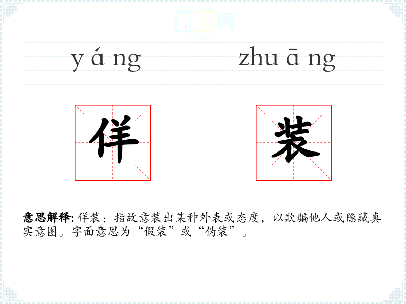 佯装:指故意装出某种外表或态度,以欺骗他人或隐藏真实意图。字面意思为“假装”或“伪装”。
