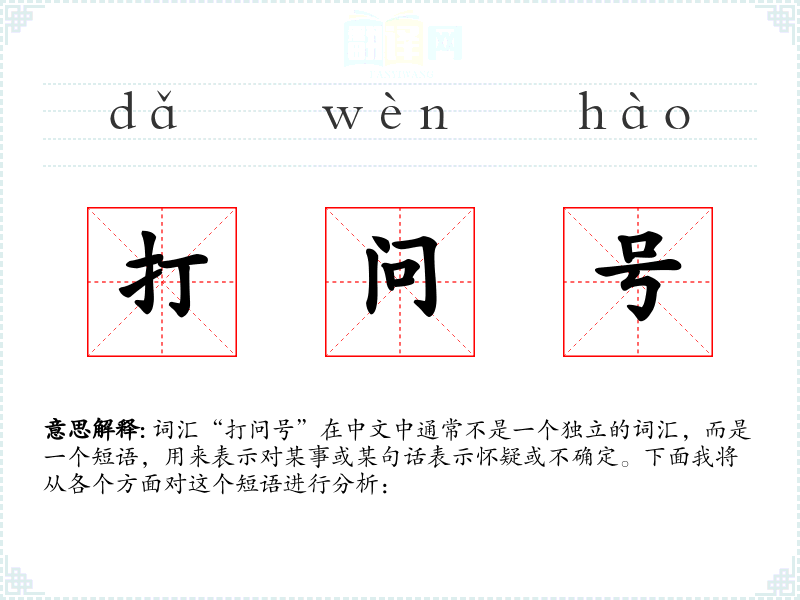 词汇“打问号”在中文中通常不是一个独立的词汇,而是一个短语,用来表示对某事或某句话表示怀疑或不确定。下面我将从各个方面对这个短语进行分析: