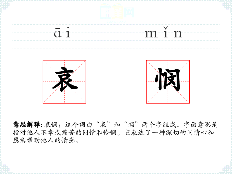 哀悯:这个词由“哀”和“悯”两个字组成,字面意思是指对他人不幸或痛苦的同情和怜悯。它表达了一种深切的同情心和愿意帮助他人的情感。
