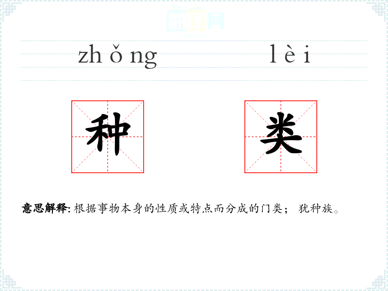 根据事物本身的性质或特点而分成的门类; 犹种族。