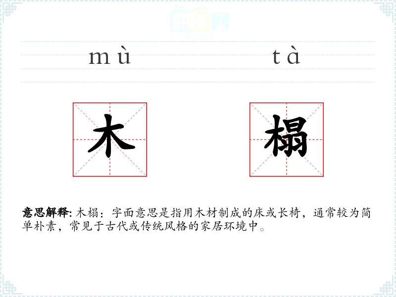 木榻:字面意思是指用木材制成的床或长椅,通常较为简单朴素,常见于古代或传统风格的家居环境中。