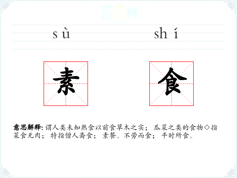 谓人类未知熟食以前食草木之实; 瓜菜之类的食物◇指菜食无肉; 特指僧人斋食; 素餐。