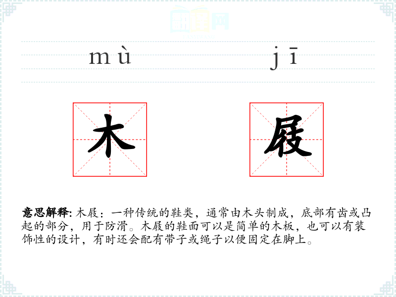 - 反义词:**鞋、高跟鞋(这些现代鞋类与木屐在材质和设计上形成鲜明对比)