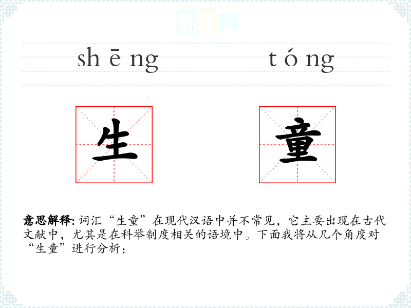 词汇“生童”在现代汉语中并不常见,它主要出现在古代文献中,尤其是在科举制度相关的语境中。下面我将从几个角度对“生童”进行分析: