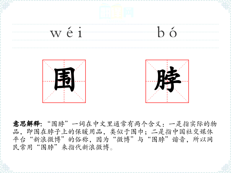 “围脖”一词在中文里通常有两个含义:一是指实际的物品,即围在脖子上的保暖用品,类似于围巾;二是指中国社交媒体平台“新浪微博”的俗称,因为“微博”与“围脖”谐音,所以网民常用“围脖”来指代新浪微博。