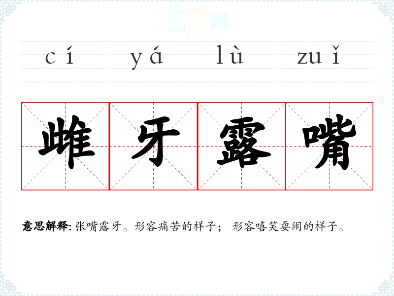张嘴露牙。形容痛苦的样子; 形容嘻笑耍闹的样子。
