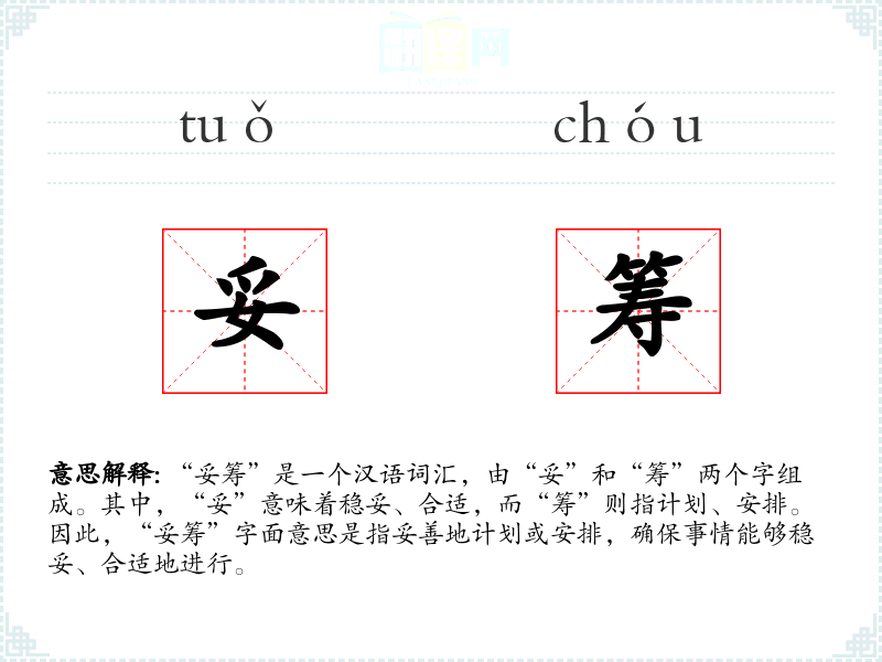 “妥筹”是一个汉语词汇,由“妥”和“筹”两个字组成。其中,“妥”意味着稳妥、合适,而“筹”则指计划、安排。因此,“妥筹”字面意思是指妥善地计划或安排,确保事情能够稳妥、合适地进行。
