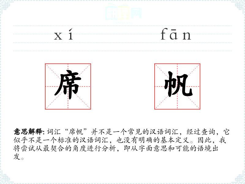 词汇“席帆”并不是一个常见的汉语词汇,经过查询,它似乎不是一个标准的汉语词汇,也没有明确的基本定义。因此,我将尝试从最契合的角度进行分析,即从字面意思和可能的语境出发。