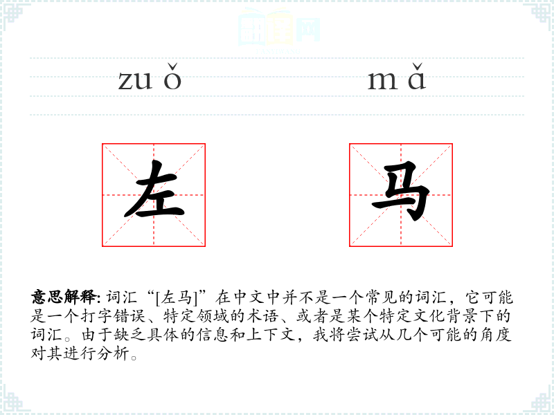 由于“[左马]”不是一个标准的中文词汇,我们无法给出确切的基本定义。如果这是一个打字错误,它可能是指“左”和“马”两个字的组合,但这种组合在中文中没有特定的含义。