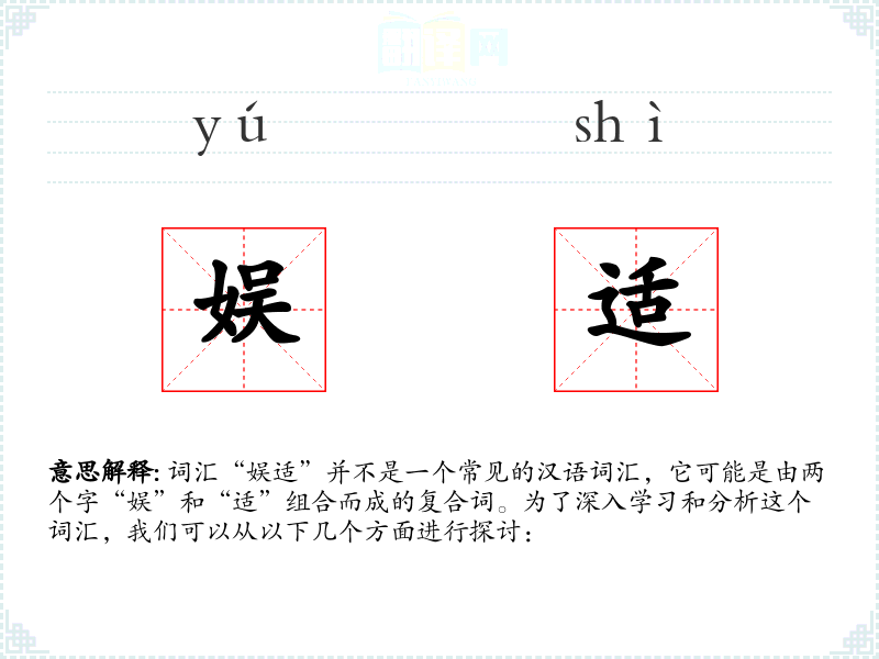 词汇“娱适”并不是一个常见的汉语词汇,它可能是由两个字“娱”和“适”组合而成的复合词。为了深入学习和分析这个词汇,我们可以从以下几个方面进行探讨:
