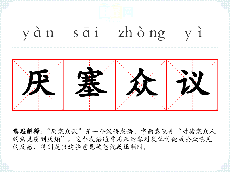 “厌塞众议”是一个汉语成语,字面意思是“对堵塞众人的意见感到厌烦”。这个成语通常用来形容对集体讨论或公众意见的反感,特别是当这些意见被忽视或压制时。