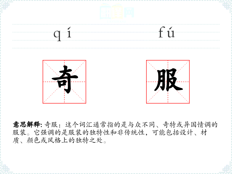 奇服:这个词汇通常指的是与众不同、奇特或异国情调的服装。它强调的是服装的独特性和非传统性,可能包括设计、材质、颜色或风格上的独特之处。