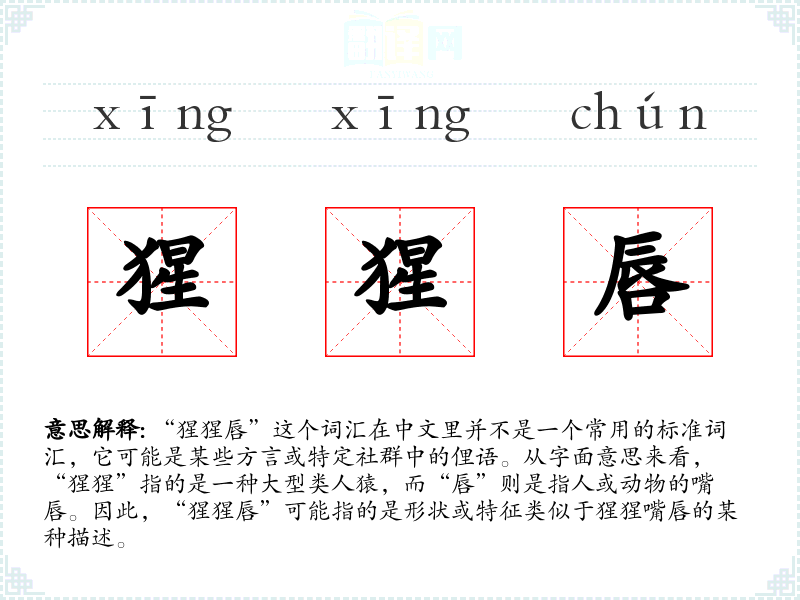 结合图片,可以想象猩猩的嘴唇特征,以及如何将这种特征应用到人类形象上。听觉上,这个词汇可能不会引起特定的声音联想,除非是在特定的方言或口音中发音。