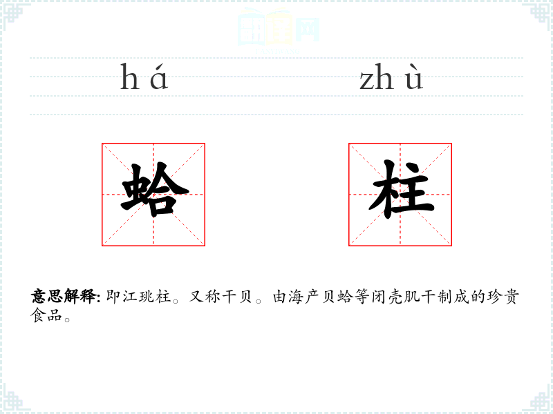 即江珧柱。又称干贝。由海产贝蛤等闭壳肌干制成的珍贵食品。