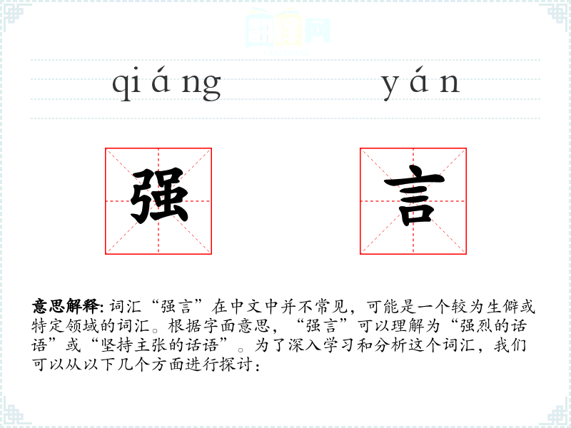 词汇“强言”在中文中并不常见,可能是一个较为生僻或特定领域的词汇。根据字面意思,“强言”可以理解为“强烈的话语”或“坚持主张的话语”。为了深入学*和分析这个词汇,我们可以从以下几个方面进行探讨: