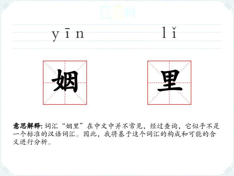 词汇“姻里”在中文中并不常见,经过查询,它似乎不是一个标准的汉语词汇。因此,我将基于这个词汇的构成和可能的含义进行分析。