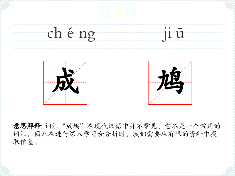词汇“成鸠”在现代汉语中并不常见,它不是一个常用的词汇,因此在进行深入学*和分析时,我们需要从有限的资料中提取信息。