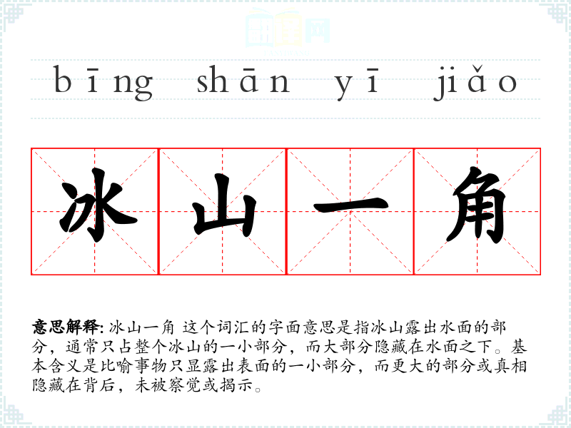 冰山一角 这个词汇的字面意思是指冰山露出水面的部分,通常只占整个冰山的一小部分,而大部分隐藏在水面之下。基本含义是比喻事物只显露出表面的一小部分,而更大的部分或真相隐藏在背后,未被察觉或揭示。