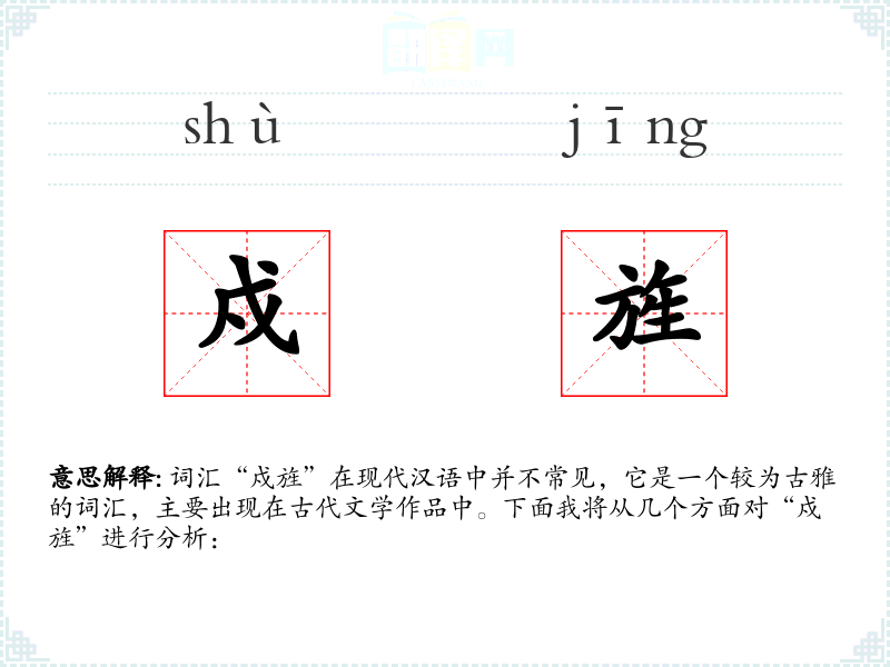 词汇“戍旌”在现代汉语中并不常见,它是一个较为古雅的词汇,主要出现在古代文学作品中。下面我将从几个方面对“戍旌”进行分析: