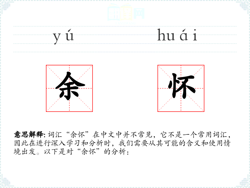 词汇“余怀”在中文中并不常见,它不是一个常用词汇,因此在进行深入学习和分析时,我们需要从其可能的含义和使用情境出发。以下是对“余怀”的分析: