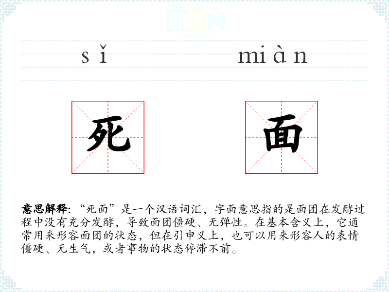 “死面”一词的词源较为直接,由“死”和“面”两个字组成,分别表示无生命和表面。在语言的演变中,这个词从描述面团的状态扩展到了形容人的表情或事物的状态。