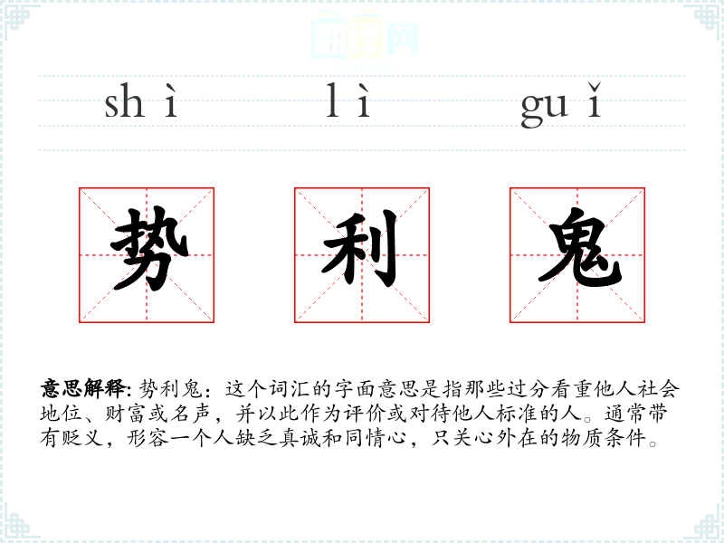“势利”一词源于汉语,最初可能与权力和地位有关,后来逐渐演变为形容那些过分看重外在条件的人。在现代汉语中,“势利鬼”已经成为一个常用词汇,广泛用于日常交流和文学创作。