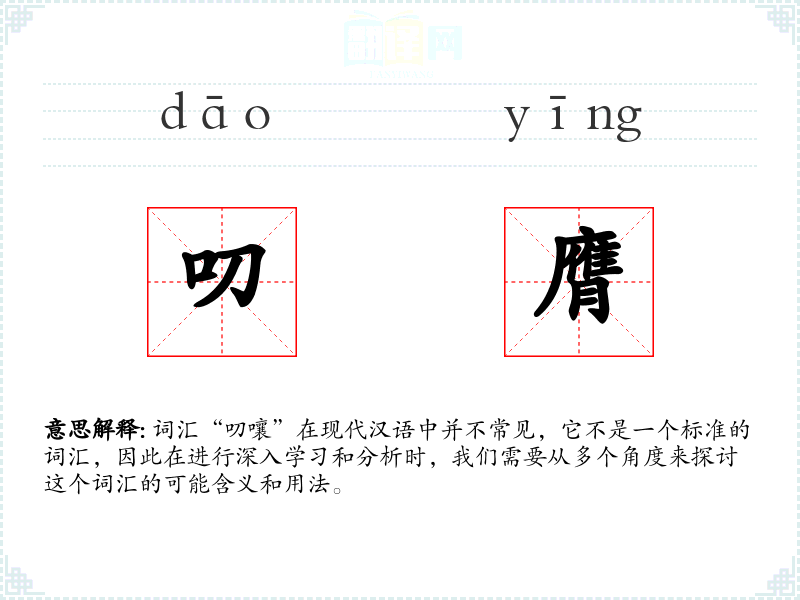 由于“叨嚷”不是一个标准词汇,我们无法给出一个确切的字面意思和基本含义。它可能是“叨”和“嚷”两个字的组合,其中“叨”通常指说话唠叨,而“嚷”则指大声喊叫。因此,“叨嚷”可能指的是一个人唠叨且大声说话的状态。