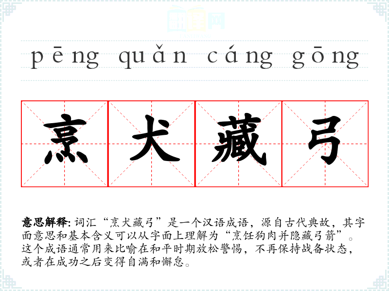 词汇“烹犬藏弓”是一个汉语成语,源自古代典故,其字面意思和基本含义可以从字面上理解为“烹饪狗肉并隐藏弓箭”。这个成语通常用来比喻在和平时期放松警惕,不再保持战备状态,或者在成功之后变得自满和懈怠。
