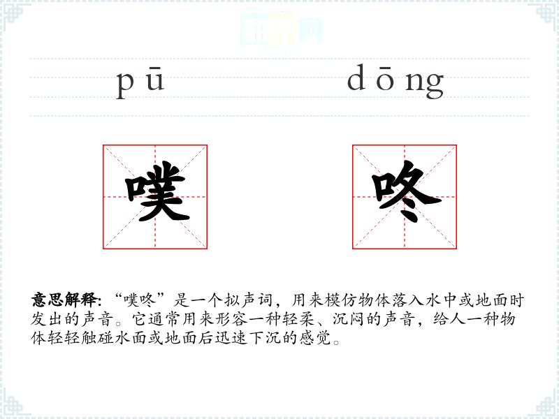 “噗咚”作为一个拟声词,其词源较为简单,主要是通过模仿声音来形成词汇。在语言演变中,拟声词通常保持相对稳定,因为它们直接关联到听觉体验。