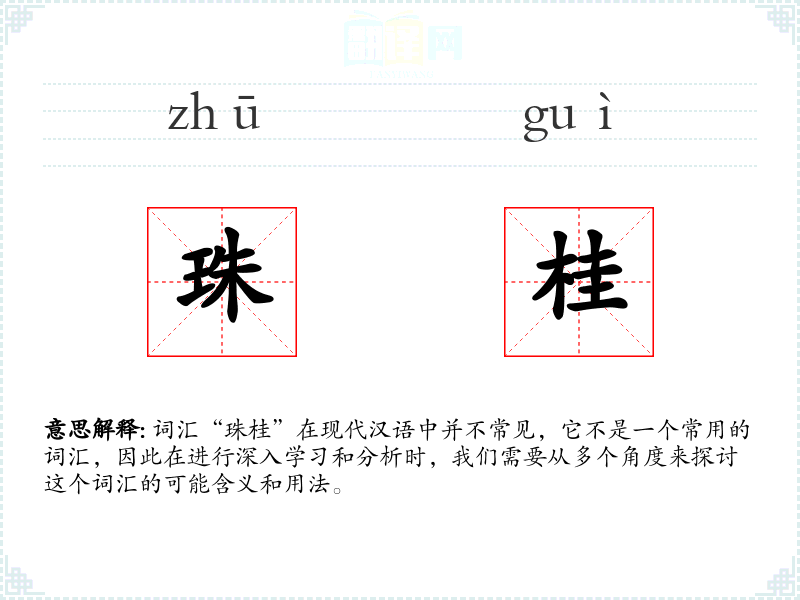 由于“珠桂”不是一个常用词汇,关于它的词源和历史演变的信息非常有限。它可能是由“珍珠”和“桂树”两个词汇结合而成的一个复合词,用以形容珍贵和高雅的事物。