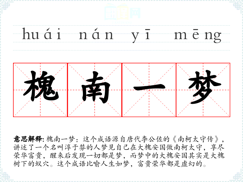 槐南一梦:这个成语源自唐代李公佐的《南柯太守传》,讲述了一个名叫淳于棼的人梦见自己在大槐安国做南柯太守,享尽荣华富贵,醒来后发现一切都是梦,而梦中的大槐安国其实是大槐树下的蚁穴。这个成语比喻人生如梦,富贵荣华都是虚幻的。