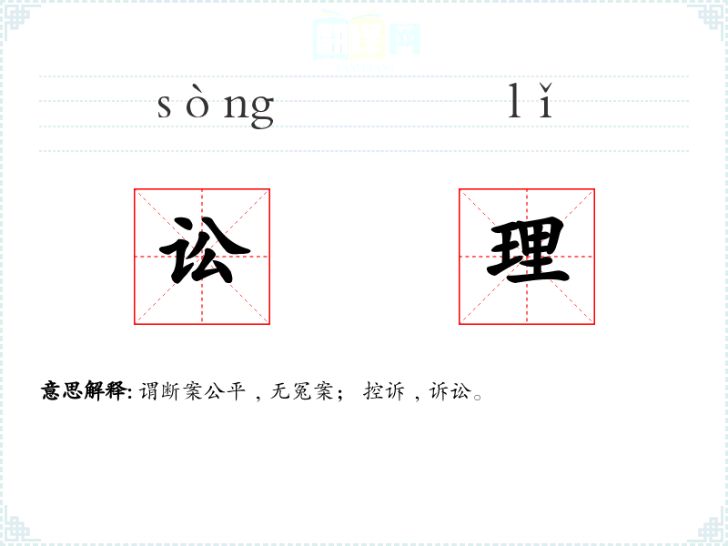 谓断案公平﹐无冤案; 控诉﹐诉讼。