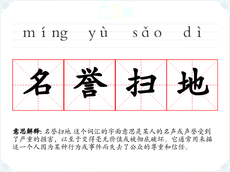 名誉扫地 这个词汇的字面意思是某人的名声或声誉受到了严重的损害,以至于变得毫无价值或被彻底破坏。它通常用来描述一个人因为某种行为或**而失去了公众的尊重和信任。