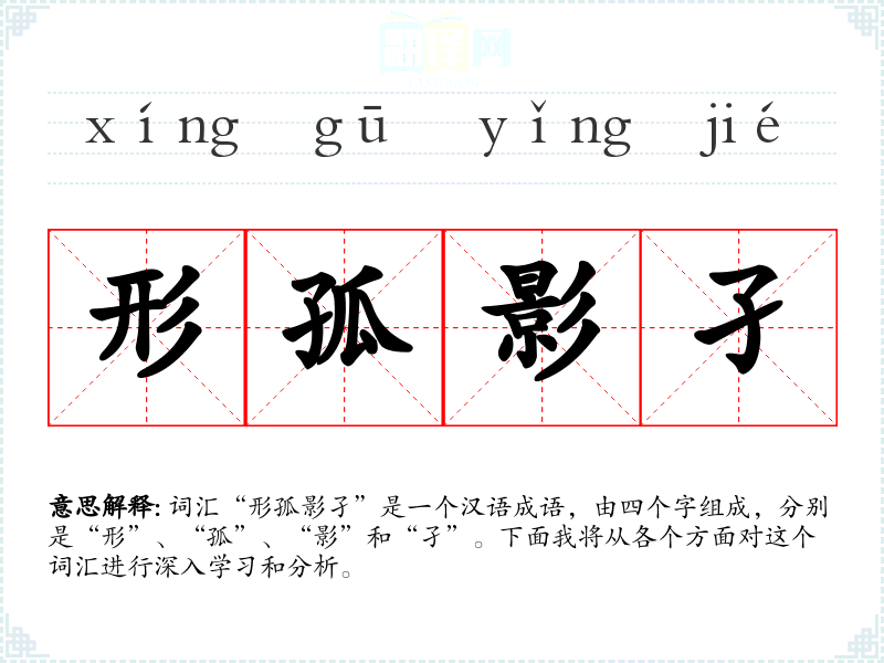 词汇“形孤影孑”是一个汉语成语,由四个字组成,分别是“形”、“孤”、“影”和“孑”。下面我将从各个方面对这个词汇进行深入学*和分析。