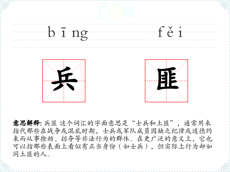 兵匪 这个词汇的字面意思是“士兵和土匪”,通常用来指代那些在战争或混乱时期,士兵或军队成员因缺乏纪律或道德约束而从事抢劫、掠夺等非法行为的群体。在更广泛的意义上,它也可以指那些表面上看似有正当身份(如士兵),但实际上行为却如同土匪的人。
