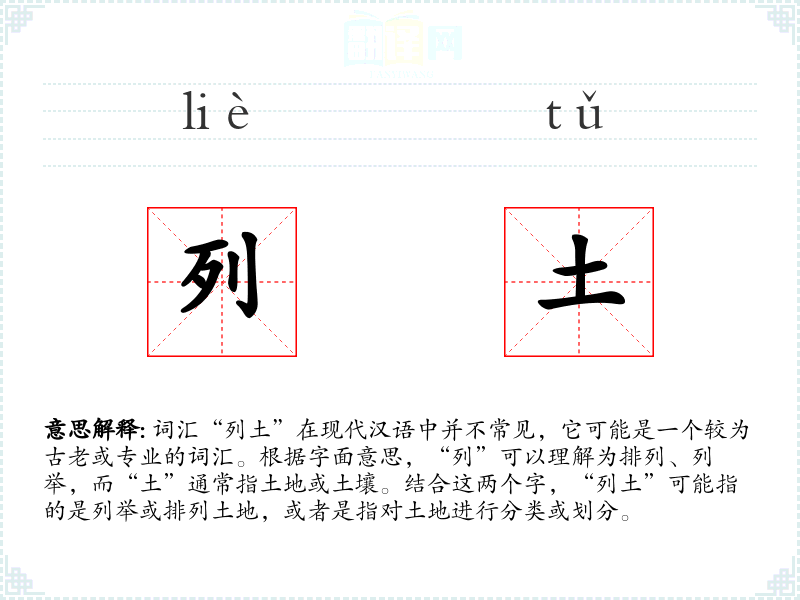 词汇“列土”在现代汉语中并不常见,它可能是一个较为古老或专业的词汇。根据字面意思,“列”可以理解为排列、列举,而“土”通常指土地或土壤。结合这两个字,“列土”可能指的是列举或排列土地,或者是指对土地进行分类或划分。