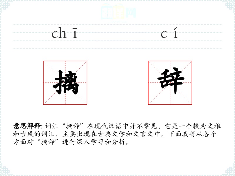 “摛辞”的字面意思是铺陈辞藻,即运用华丽的辞藻来表达思想或情感。它强调的是在文学创作中对语言的精心雕琢和修饰。