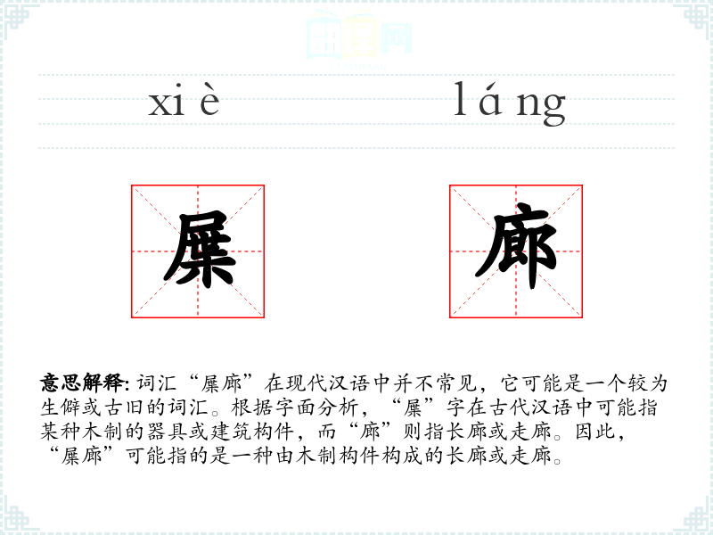 词汇“屟廊”在现代汉语中并不常见,它可能是一个较为生僻或古旧的词汇。根据字面分析,“屟”字在古代汉语中可能指某种木制的器具或建筑构件,而“廊”则指长廊或走廊。因此,“屟廊”可能指的是一种由木制构件构成的长廊或走廊。