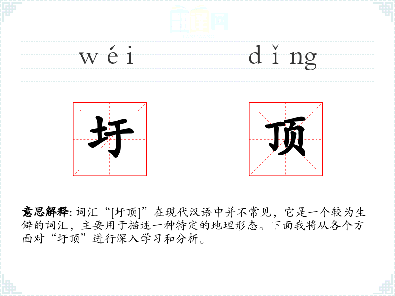 词汇“[圩顶]”在现代汉语中并不常见,它是一个较为生僻的词汇,主要用于描述一种特定的地理形态。下面我将从各个方面对“圩顶”进行深入学*和分析。