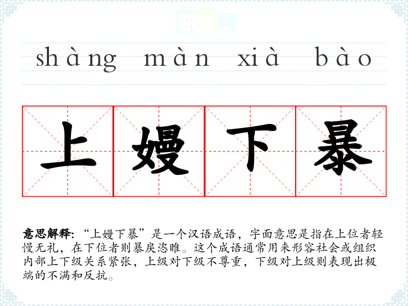 “上嫚下暴”是一个汉语成语,字面意思是指在上位者轻慢无礼,在下位者则暴戾恣睢。这个成语通常用来形容社会或组织内部上下级关系紧张,上级对下级不尊重,下级对上级则表现出极端的不满和反抗。