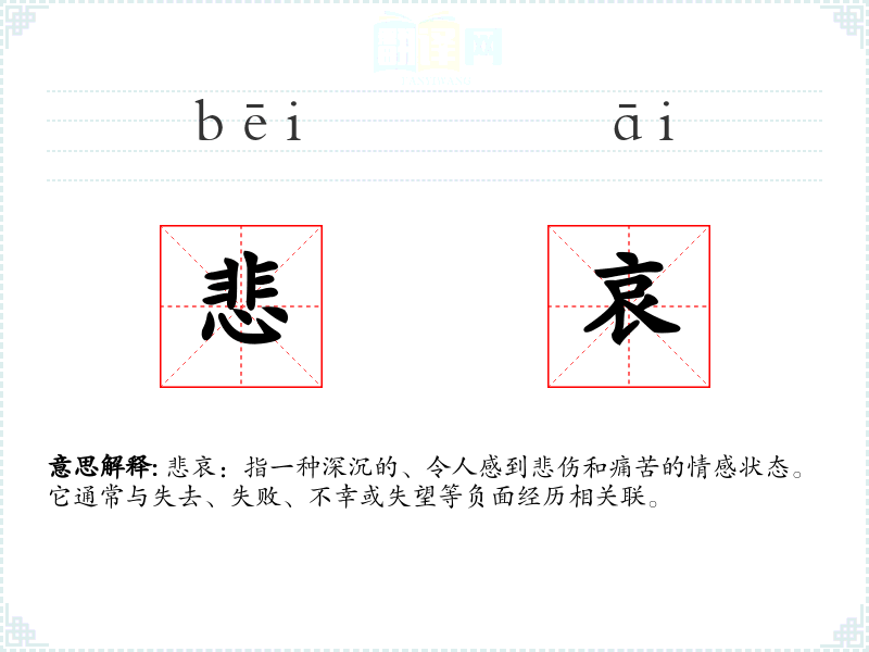 悲哀:指一种深沉的、令人感到悲伤和痛苦的情感状态。它通常与失去、失败、不幸或失望等负面经历相关联。